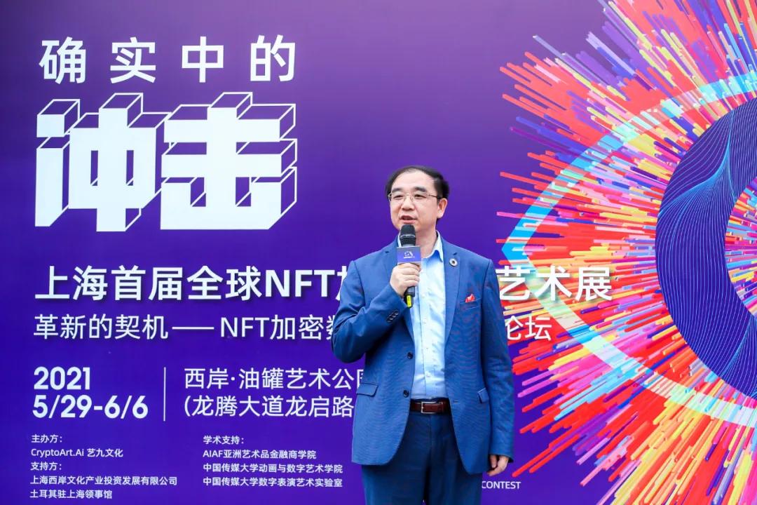 开幕式上,亚洲艺术品金融商学院创始人范勇院长作为致辞嘉宾,首先肯定了NFT作为创新的技术工具,通过区块链加密的方式,改变了过去艺术在版权、发布和交易等方面的常规模式,而同一时间,也提出了对热潮下NFT加密艺术潜在风险问题的一些思考。最后,范勇院长预祝了本次展览的成功举办。