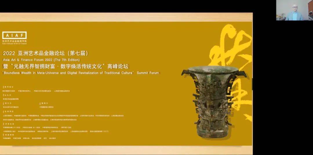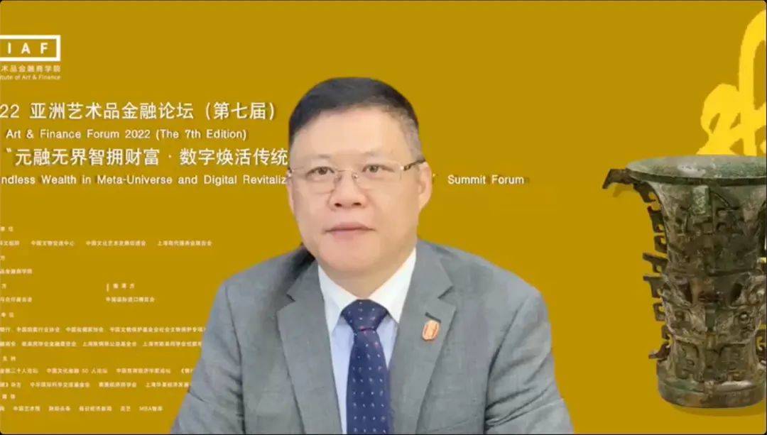 下半场聚焦“金融赋能文物艺术品的保护与传承”以及“元宇宙时代的文物艺术品焕活”。上海大学党委副书记、故宫博物院原副院长段勇和欧美同学基金会秘书长李海菊带来线上贺词。上海收藏协会创始会长吴少华,中国拍卖协会艺委会秘书长余锦生,苏富比拍卖有限公司中国艺术品部专家彭哲文,前英国铁路养老基金美术投资组合监管人Jeremy,中央财经大学文化与传媒学院院长刘双舟,香港经济师学会会长郭德心,潍坊银行原行长、董事长史跃峰,亚洲艺术品金融商学院创始人范勇,中伦律师事务所合伙人孟宪石,北京师范大学中国公益研究院院长王振耀,艺术市场评论人谢冰,惠裕全球家族智库创始人范晓曼,新媒体艺术家,四川美术学院新媒体艺术系特聘教授、硕士生导师,青鸟新媒体艺术-艺术总监林俊廷,武汉大学博士生导师,中国人民大学文化产业研究院特聘研究员、文旅部科技教育司原司长孙若风、中央财经大学文化经济研究院院长魏鹏举等嘉宾分别从博物馆、艺术品市场、金融赋能与元宇宙科技发展方面为我们诠释金融如何赋能艺术文物品的保护与传承,以及元宇宙时代的创新格局和战略思路。