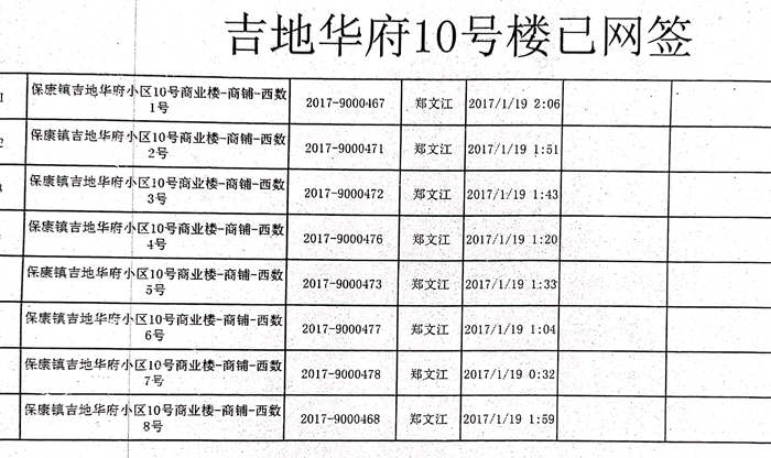 在接受采访时,徐凤琴告诉记者:吉地华府之所以到了今天这种地步,与当地政府的监管严重缺位有直接的关系,就在我们上访、打官司的过程中,有关部门还在帮助对方转移财产。我们从科左中旗政府调出来的吉地华府5号、6号、10号楼网签单子清楚的记载着这样令人不可思议的内幕:政府部门的工作人员晚上甚至半夜还在帮助对方打印单子转移财产。我们曾经就此事问过政府官员,他们居然称是下面的人办的。我们就纳闷了,如果不是上面的领导让这样做的,下面的普通工作人员怎么可能半夜上班打印单子呢?
