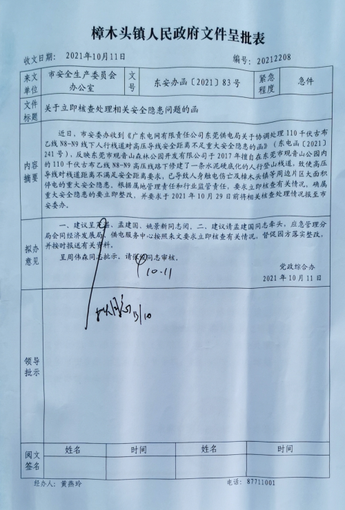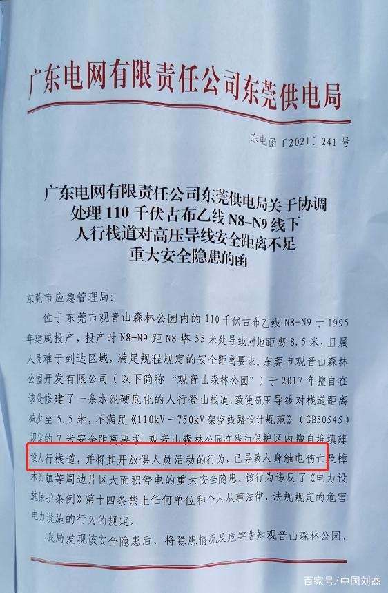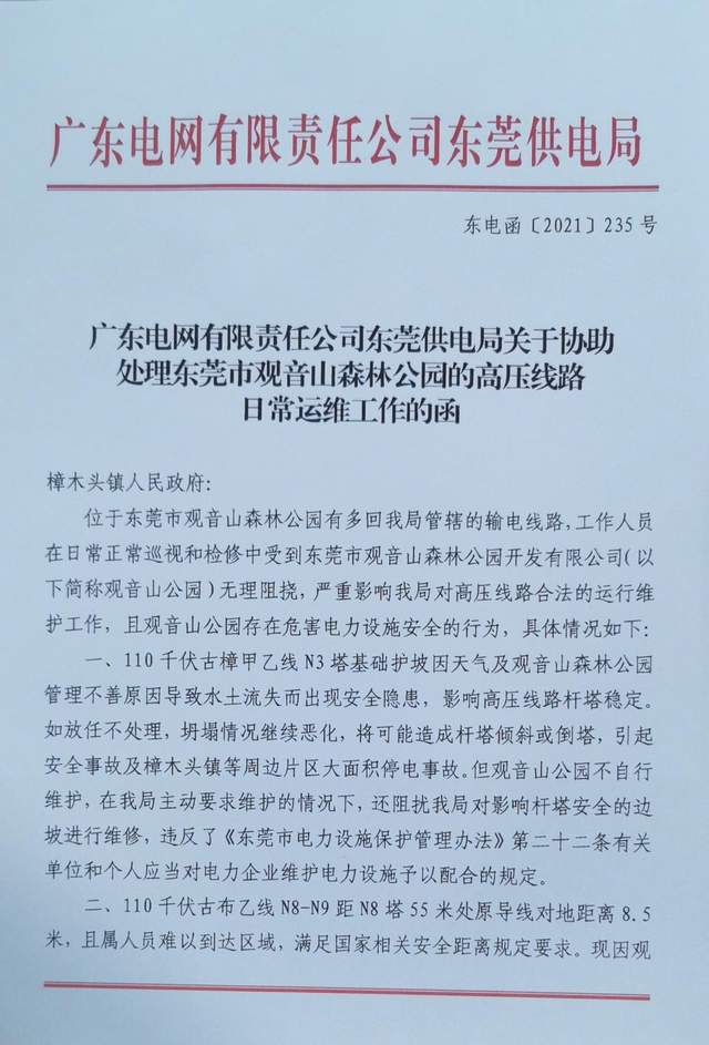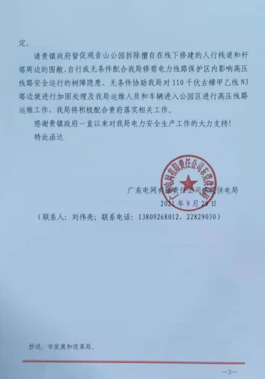 本来,东莞市供电局应该是一个为百姓为企业“发光”的国企单位,这次却完全一条道走到黑,再一次展开了疯狂报复。2021年9月28——10月11日,供电部门连续十几天里,向当地政府、安委、应急近10个部门发函称:因观音山擅自修建人行栈道,致使高压线不满足安全距离,导致已有人触电身亡和大规模停电。