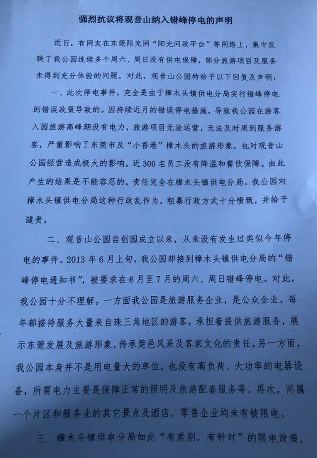 据了解,在当地同属一个地域片区和服务行业性的其它景点及酒店、零售企业均未有被限电,唯独观音山被纳入错峰限电对象。观音山作为一家旅游企业,需要保障游客服务和旅游的生产经营,却无故被纳入错峰用电对象,樟木头镇供电分局此举完全违背了国家“重点保障教育、公共、服务业”的初衷。