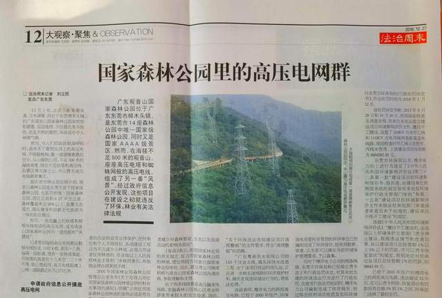 早在2013年人民网就转发《经济参考报》报道,"南方电网东莞重点项目未批先建,强制架设高压线",因高压线路架建将直接影响到公园景观,并担心施工可能会导致山体松动造成水土流失,易形成山体塌方,架建工程一度曾遭到观音山方面的反对。