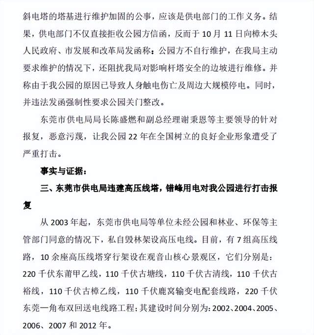 (另:2007年7—8月间,供电公司为了配合东莞市委刘志庚(2017年已被判无期刑)抢夺观音山公园经营权,连续对公园无故停电45天,造成公园和游客的极大困难。)