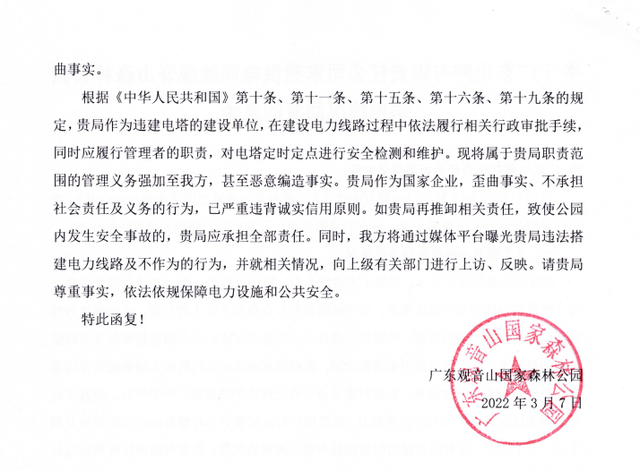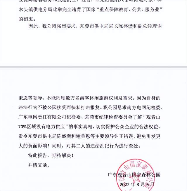 二、然而,东莞市供电局避实就虚、故意歪曲的回复内容,与发生在观音山的事实严重不符。深受欺凌折磨的观音山于2022年3月6日就南电案事件正式向南方电网纪检委、广东电网有限公司纪检委、东莞市纪律检查委员会进行反映,反映其供电部门及相关领导有法不依,并于3月7日委托律师谴责其推诿塞责不作为等行为。