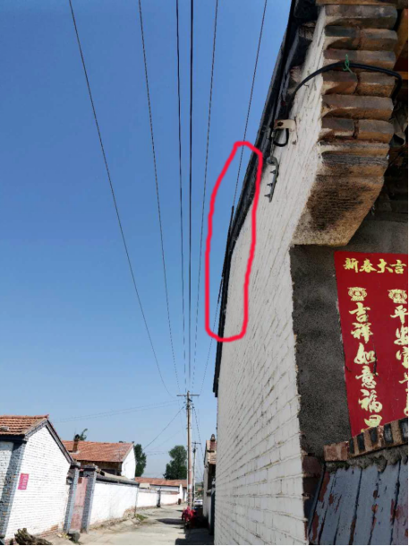 九泉村变台、部分线杆未改造,个别线杆倾斜严重,电线搭接在村民房顶上,套管已经磨损电线外露。
