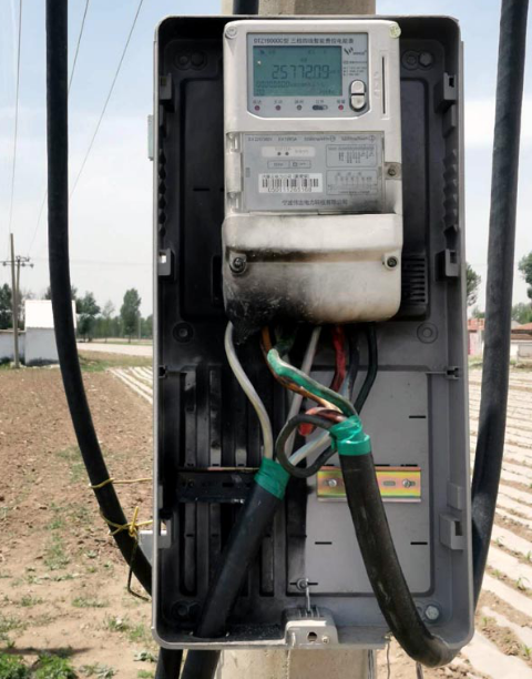 比如本该进行全部更换的线杆,在改造中则是间隔式的更换新线杆,即每隔一个旧线杆更换一个新线杆,形成了新线杆和老旧线杆“混搭”的现像。有些电线杆已经发生裂纹,在改造中仍没有更换。在马家圐圙,几个老人正在树下乘凉,当我们询问有关农网改造一事时,一位村民指着旁边一个电线杆说,“闹啥好嘛,这个电线杆都裂了也木有换”。我们仔细观察发现,村民指的这个电线杆还是老旧的水泥杆,杆体已经发生爆裂,裂缝很大,但在农网改造时却没有被更换。村民说,去年改造时就只换了线和电表。