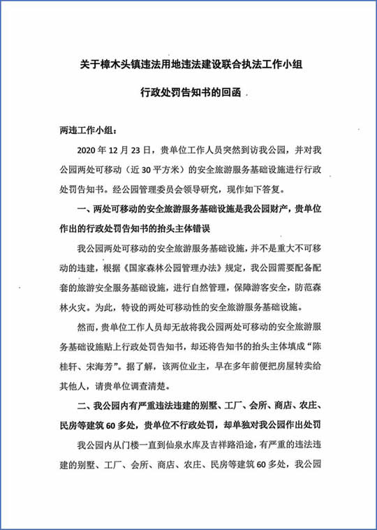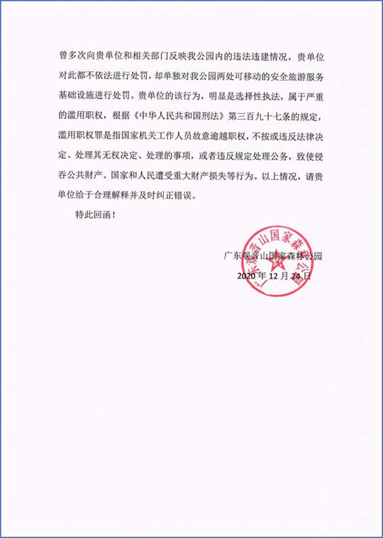 而面对这样选择性的执法行为,观音山公园于2020年10月30日正式回函据理力争,提出如下几方面异议: