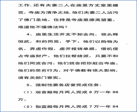 释延祥:印张儒平和罗成香还在,赖在观音寺不走,不然怎么叫长期霸占。我是2009—2011年在观音寺做住持后由释恒武住持观音寺,之后在法成大和尚住持观音寺期间,知道了张儒平家族在观音寺盗取功德款的事后,为了切断张儒平家族对观音寺的控制,就对张儒平的小姨子罗五妹和她老公王俊进行迁单(佛教用语:即开除)。