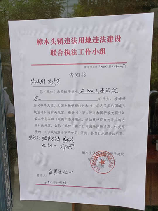 2020年12月23号,东莞市两违工作小组的人登上观音山,他们贴封条然后走人。