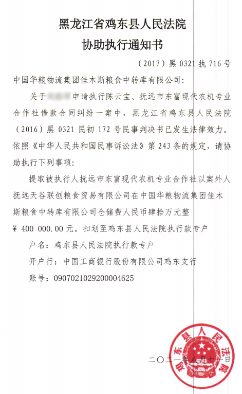 2020年,天谷公司通过上诉,请求依法判令停止执行鸡东县法院作出的执行裁定书。没想到,2020年10月,鸡东县法院又裁定继续扣留天谷公司的仓储租金190万元。而且另一名与刘某同样的债权人金某也申请了强制执行东富合作社80余万元欠款,2021年,法院也作出了冻结天谷公司仓储费80余万元的裁定。
