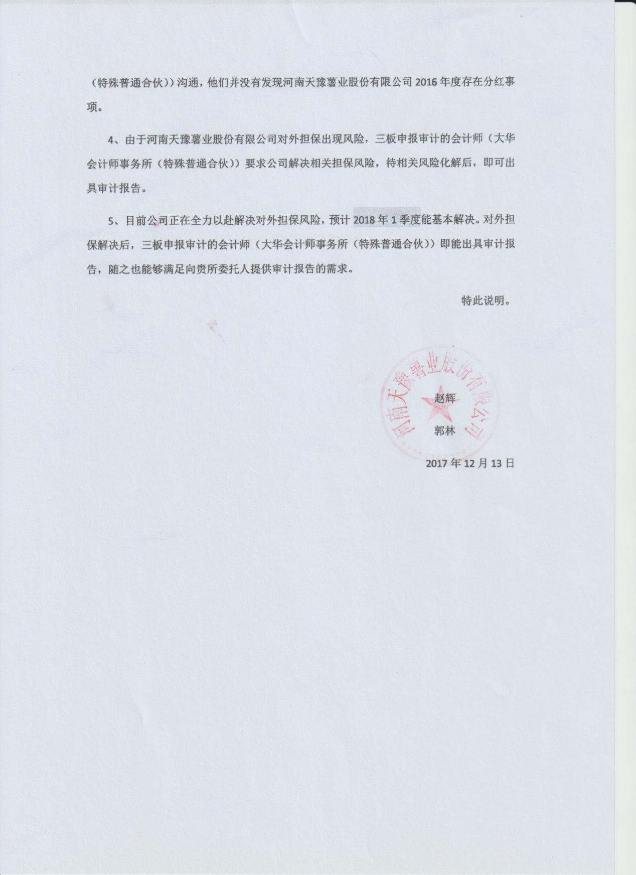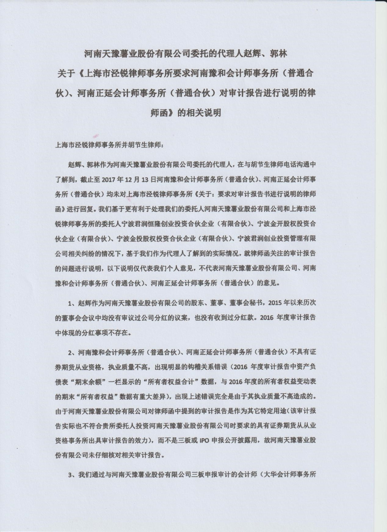王律向记者展示了天豫薯业提交的2016年财务报表审计报告复印件和审计报告相关说明,《现金流量表》和《利润表》页面均加盖了天豫薯业的公章、法人赵天学的印鉴和主管会计工作负责人陈振宇的印章。审计报告相关说明出具日期为2017年12月13日,加盖有天豫薯业公章和赵辉、郭林二人签名,说明中提到“以下说明仅代表我们个人意见,不代表天豫薯业、河南豫和会计师事务所(普通合伙)、河南正延会计师事务所(普通合伙)的意见。”、“赵辉作为天豫薯业的股东、董事、董事会秘书,2015年以来历次的董事会会议中均没有审议过公司分红的议案,也没有收到过分红款。2016年度审计报告中体现的分红事项不存在。”以及“河南豫和会计师事务所(普通合伙)、河南正延会计师事务所(普通合伙)不具有证券期货从业资格,执业质量不高,出现明显的钩稽关系错位”等内容。