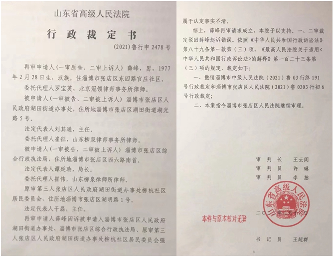 薛峰向记者介绍:他1997年从部队退伍回到家乡后,为解决住房问题向村里申请了一处宅基地,经村里批准后其在柳杭村西冯北路马路西侧建造了280多平米的自住房,自己一家人一直在此处住了20多年了。可就在2019年12月30日,本村村委会书记于磊,伙同淄博市张店区综合行政执法局队长周金马、副队长边海,张店区湖田街道办事处书记陈永财、主任王志强、副书记刘强等人,组织了100多人,雇佣挖掘机将他的唯一合法住宅强行拆除。而在强拆之前,他没有收到任何拆迁通告和通知,更没有签订过拆迁补偿协议。他当时就给110打电话报警,110警察到后,不但没有制止他们的强拆行为,反而说:“这是政府行为,我们管不了”。他已经无家可归了,为了维护自己的合法权益,他到区法院起诉,被区法院驳回了,他上诉至市法院也被驳回,他又到山东省高法申请再审。省高法经认真审查后,于2022年2月11日撤销了淄博市、张店区两级法院的行政裁定,并指令张店区法院继续审理,但张店区法院时至今日始终不予开庭审理。薛峰流着泪说:我做梦也没想到自己参军保家卫国,到头来却连自己的合法住房都保护不了,心里感到非常憋屈。