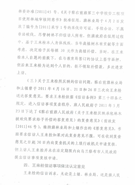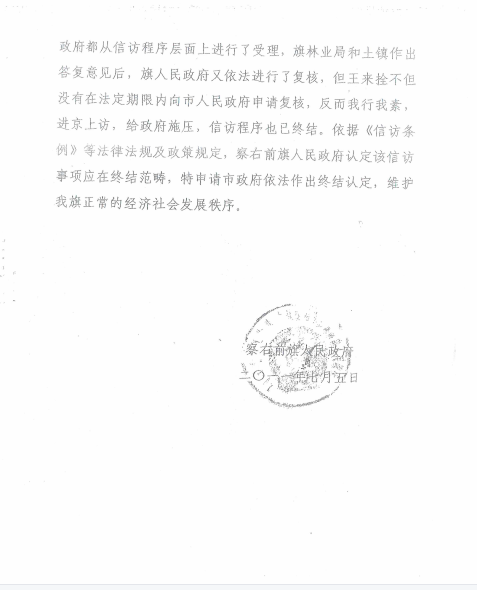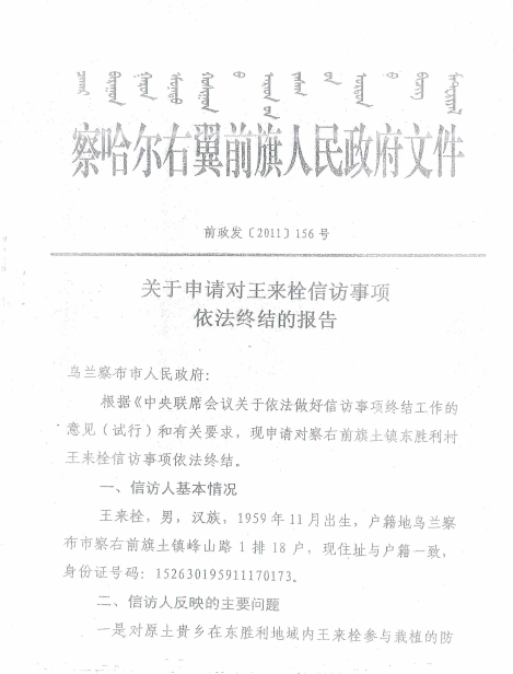 2、2011年4月5日,我向旗委信访局反映了合理诉求后,不但没有给予解决处理,而且至今天未收到过政府的任何答复,而是原信访局长贾月利串通一气捏造事实,暗箱操作。2011年5月23日做出的前政发(2011)39号虚假答复意见,至今无人给我送达的情况下,6月26日非法做出前政发(2011)43号向市政府做出认定报告,7月5日又向市政府做出前政发(2011)156号给我的信访事项依法三级终结的“假象”,并多次捏造信访备案编号码,向相关部门进行虚假汇报的事实。