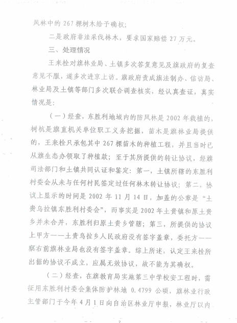 1、我在2002年3月15日在原土贵乌拉乡政府和东胜利村民委员会共同签订了由旗政府推出提供树苗、村民分段有偿承包栽种田间新造防护林植树承包“合同”和农防林产权转让协议,长2公里,植树4排,共植树苗2000余株,成活了1406株,林地面积27亩,定为30年不变,而签订好的一式4份承包“合同”有邢斌全部收回交给了当任前旗林业局副局长许恩志手中,一直没归还给我。2010年10月因旗政府教育局以建设学校为由一并征收了村民的承包耕种土地千余亩,其中,我所承包林地全部被征收,而时任镇长许恩志只给我267株树,每株树给30元,按照内蒙古自治区规定标准征收特殊林林地、林木补偿和安置补助数计算,直接给我造成经济损失120余万元,没有给我分文。