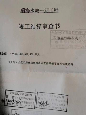 在海南琼海瑞海一期工程施工过程中,涉嫌虚报工程量。该工程以210530510元中标,最后结算价到39559140152元(有海南某某广和投资咨询管理有限公司作出的“竣工结算审查书为证”),新增将近两个亿。其中单一个外墙保温基本没施工,就虚报了四、五千万元,黄某忠涉嫌非法获取了至少1个多亿元(有黄某忠聘请的结算人员钱某某的电话录音为证)。