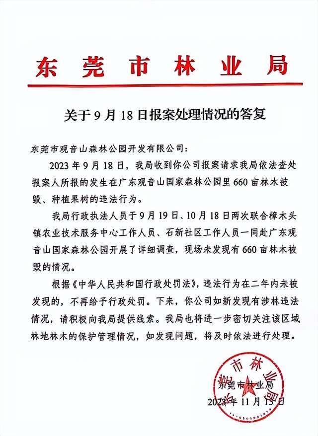 2023年9月,观音山发现当年被林下套种荔枝树苗的这660亩范围,不仅没有退果还林,恢复森林植被,反而原有的树林已被蚕食殆尽,全是早已能结果的荔枝树了,于是向东莞市林业局再次举报。而东莞市林业局却答复称,“现场未发现有660亩林木被毁的情况。”“根据《行政处罚法》,违法行为在二年内未被发现的,不再给予行政处罚。”