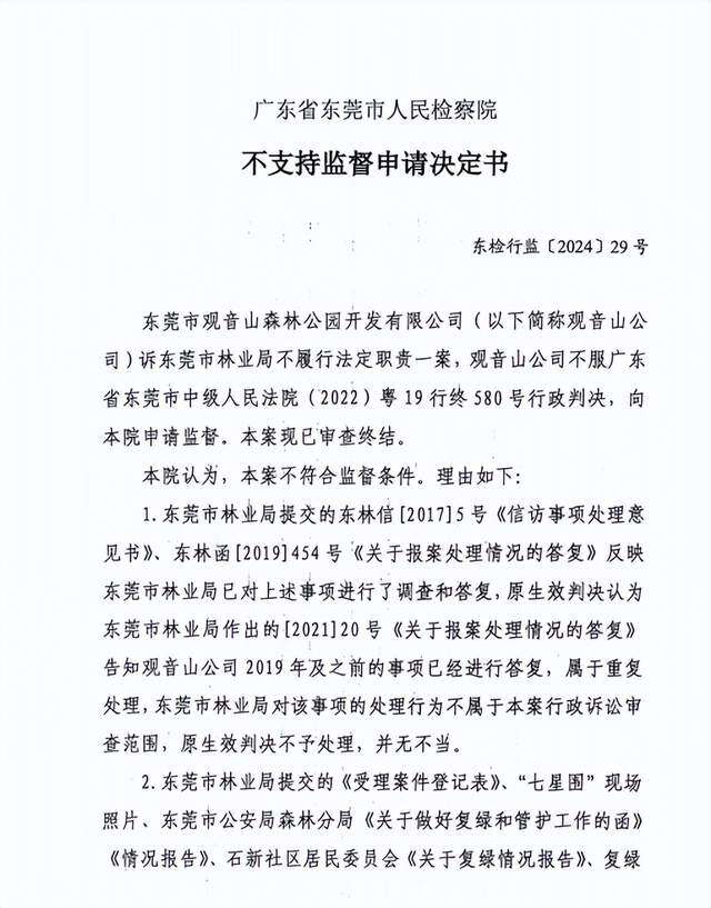 观音山将不作为的樟木头镇政府起诉到法院,东莞市第一法院却以被举报人取得别墅用地在前,观音山取得公园承包经营权在后,樟木头镇政府对举报事项的处理不会影响观音山的权利义务,观音山没有提起行政诉讼的原告主体资格为由,于2024年8月28日作出一审裁定驳回了观音山的起诉。