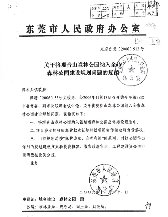 2006年10月10日,樟木头镇政府向东莞市政府上报文件《关于将观音山森林公园纳入全市森林公园建设规划的请示》,请求由市政府投入主要资金进行基础及配套设施建设。同年11月11日,东莞市政府作出《关于将观音山森林公园纳入全市森林公园建设规划问题的复函》,批准“将观音山森林公园纳入银瓶嘴森林公园总体建设规划中”、“项目设计的收回经营权及征地补偿费用由你镇政府负责解决”、“工程建设资金有市镇两级按比例分担”。