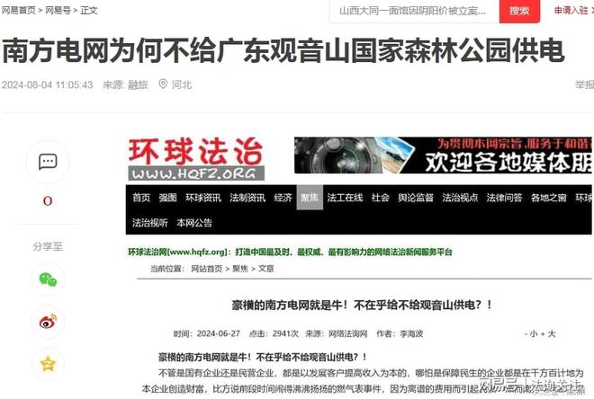 于是撰稿人仔细查看了这篇1万余字的文章,发现了又这么100字提及了南方电网问题“特别是南方电网属下的东莞市供电局拒绝给公园供电:2020年12月22日央视《谈事说理》栏目播出专题“《谈事说理》之搁浅的公园”其中就着重谈到观音山国家森林公园悬而未决的基本供电问题,之后全网和知名专家为之呼吁至今仍未解决。”同时配了一幅网文截图。