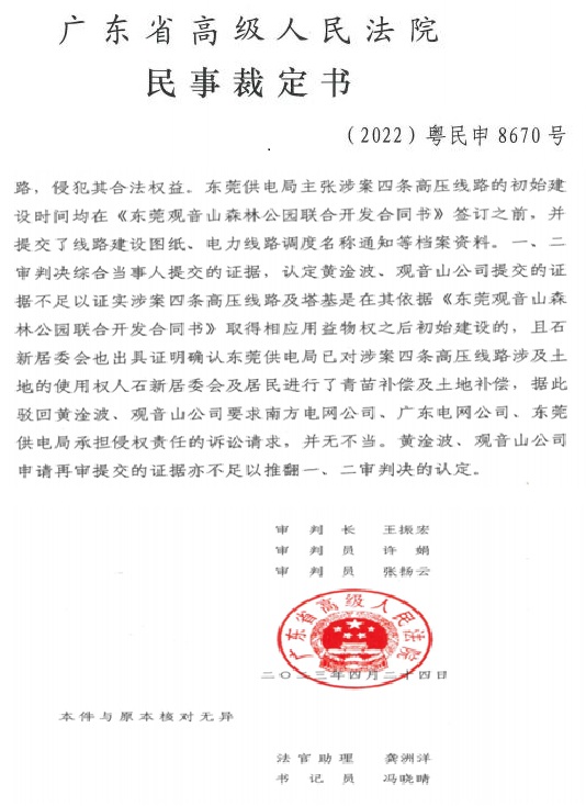 三是“根据《供用电合同》将电力供应至公园的产权分界点。在高压线塔架设纠纷中,观音山公司三次诉讼均败诉,法院认定线路建设早于公司承包经营,未构成侵权。”就此案件,多位法学专家认为:案涉四条高压线路的真实初始修建时间和是否为观音山公司承包前就已存续存在一定争议,一审、二审法院直接认定属观音山公司承包前已存续或变更升级改造而来是否得当?为何观音山均败诉?法院认为这些高压线并未架设在公园的红线范围内,故供电部门没错。而公园提供给法院证明高压线确实架设在公园范围内的证据文件《观音山国家森林公园总体规划》以及各工程施工的时间等均未被法院认可。出现这种结局,如果说此案没有行政力量干预司法,鬼都不信!而南方电网正是通过干预司法这种违法行为,为自己继续违法再次打脸了社会和法治。笔者倒是要请求广大游客,您们到观音山公园旅游时,看看那几十座高压线铁塔是不是在公园内的森林里,多照些照片发到朋友圈,让全社会都看一看,南方电网和东莞的某些法官是如何的颠倒黑白狼狈为奸,如此的睁眼说瞎话进行判案,这笔账今后一定要算的,毕竟太扯了。