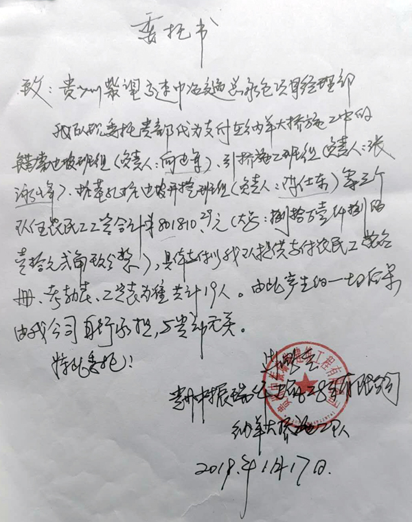 2019年1月17日,农民工们再次来到了贵州望谟县讨要工资。贵州中振瑞华建筑工程有限公司称没钱支付,先后给农民工代表向建军和陈仕东出具委托书和欠条并附工资表,要其向甲方(贵州紫望高速公路中国中冶总承包项目经理部)讨要,甲方以贵州中振瑞华建筑工程有限公司没有结算账上没钱进行搪塞、不予理睬。