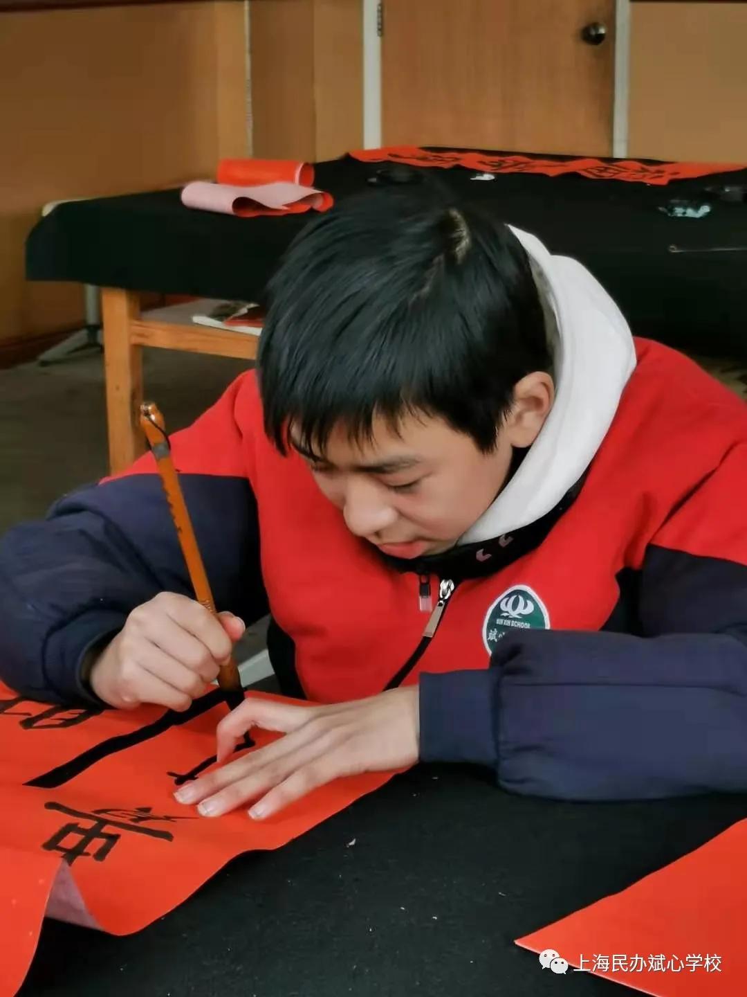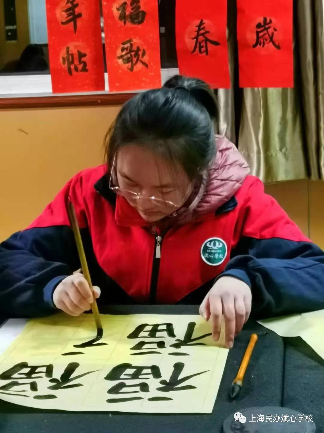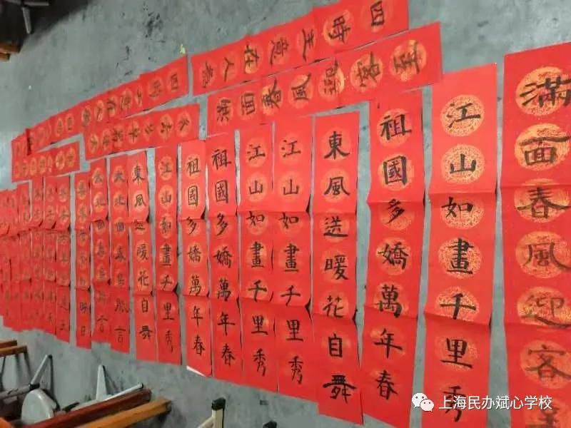 临近期末,对书法班和伏羲六、七班的学生根据学习水平安排学习写“福”字和“春联”。在最后几天时间里,要完成数百幅“春联”和数百个“福”字。让家长们带回家过年。时间短,任务紧,孩子们用书法课时间和午休的时间和老师一起拼到最一天才算完成任务。其实,期间很多孩子都写到手软,个别学生不想动笔。我们就用一个班写的春联成品与两位老师竞争看谁写得多,来调动大家。看到孩子们的拼劲,师生们乐在其中。