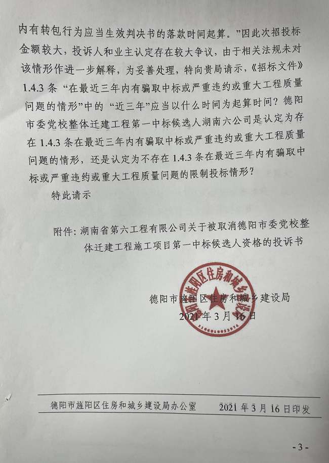 突然,2021年3月31日,业主方德阳发展控股集团有限公司(德阳发展)说,已报经旌阳区住建局裁定,现通知:经核实,你公司(湖南六建)在本项目存在招标文件投标人须知第1.4.3(12)在最近三年内有骗取中标或严重违约或重大工程质量问题的情形,所以取消你公司本项目第一候标人资格。