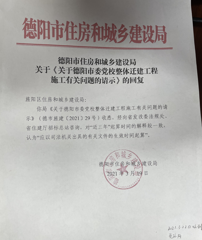 德阳市住建局称:对招标文件1.4.3(12)释法,向法定释法单位省发改委、省招标总站有请示。俩单位对媒体说没有收到德阳市住建书面请示,也没有书面答复。