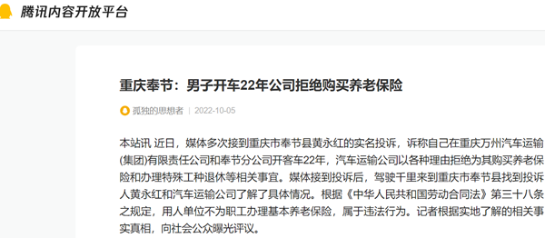 重庆奉节:男子开车22年公司拒绝购买养老保险