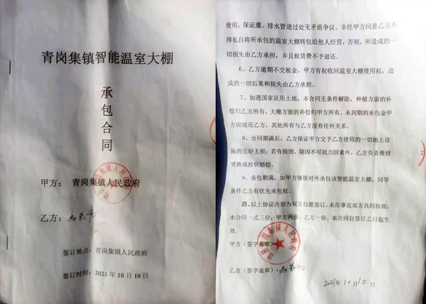 2021年10月10日,赵茂伟作为合同乙方与曹县青岗集镇人民政府签订了一份承包期为10年的《青岗集镇智能温室大棚承包赁合同》,曹县青岗集镇人民政府作为合同甲方保证乙方在签约地人员人身安全不受无端伤害,保证棚周环境安全,以防大棚遭受破坏,保证乙方水、电、路正常使用,保证灌、排水管道过处无矛盾争议。