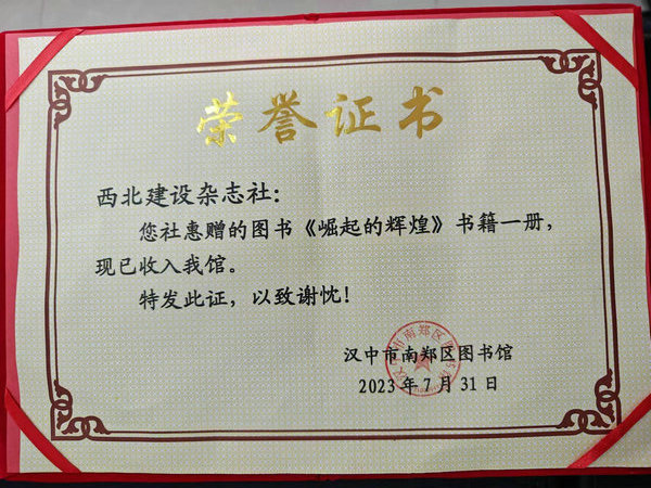 2023年7月31日,由西北建设杂志社出版的大型画册《崛起的辉煌——陕西城市建设20年成果汇编》被南郑区图书馆收藏,该馆馆长刘斌向杂志社颁发了收藏证书,对杂志社的辛勤付出表示感谢,并表示该馆将会精心保存画册,编制索目,便于读者查询、借阅。