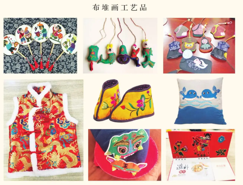 华彩合作社是一家集工艺美术品制造、床上用品、服装加工、销售、口罩、防护服加工于一体的综合性现代化纺织加工企业。成立之初,她和她的4位姐妹们,在小打小闹中以棉纺织土布为材料,在高温下,染以青、赤、黄、白、黑诸色,耐洗不掉色,色彩艳丽,图案以民间传说、戏剧人物、民俗生活、花鸟禽兽为题材,运用纯民间的复合造型法,进行拼贴、镶花、堆叠、缝合,制作出极具特色的图案。该合作社创作的布堆画元素有抓阄娃娃、24孝图、麒麟送子、门神、照雀老汉、龙王爷、灶君等等,作品寓意深刻,充满了生命的张力。