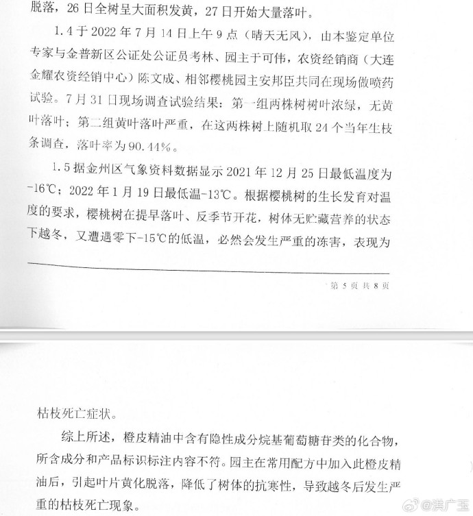 农户于可伟单独做了另一份鉴定,鉴定结论是:其使用过的“橙皮精油中含有高含量的隐性成分烷基葡萄糖苷类的化合物,所含成分和产品标识的内容不符”,“园主在常用配方中加入此橙皮精油后,引起叶片黄化而大量脱落,促使樱桃反季节开花,从而降低树体的抗寒性,导致越冬后发生严重的枯枝死亡。”(图4)