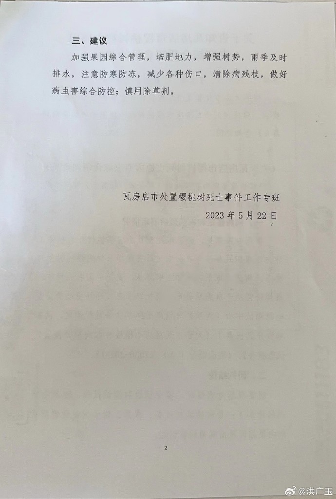 他们请了一批专家来做研判。专家研判是处理农业生产事故的正常操作,本身没啥可说的,但是,问题出在研判的专家构成和研判方向上。 这里就该轮到樱桃树行业知名活动家——北京农林科学院的张开春研究员上场了。