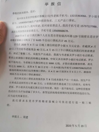 提示:突如其来的疫情,让口罩一时间成了全球走俏的硬通货,口罩机也随之成了商家眼中的印钞机。 近日,河南省滑县的周先生向本报网反映称:2020年4月12日在东莞市罗特精密机械公...