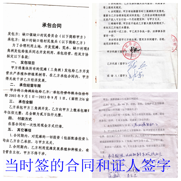 他回忆,1998年,为了合理利用土地,开发荒滩,龙桥镇缺口社居委(原缺口镇缺口村委会)将集体所有的256亩荒滩(三角洲)发包给他开发,用于水产养殖和林木种植,并签订了承包合同。