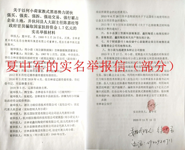 实名举报人:夏中军,男,1968年5月20日生,汉族,吉林省夏兴有机生态生物高科集团有限公司董事长,现在长春市铁北监狱服刑。