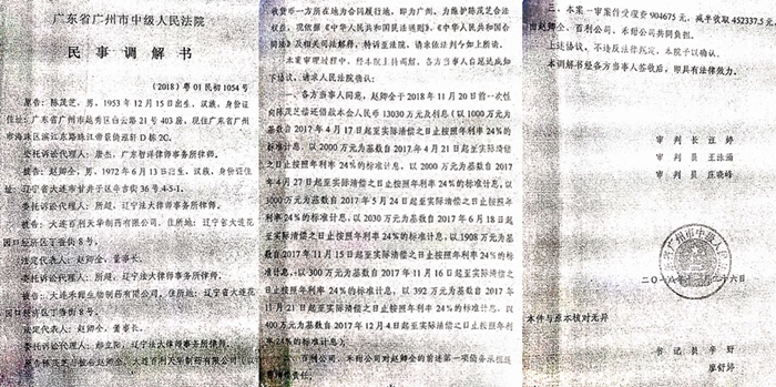 2018年,赵卿全与案外人陈茂芝签订虚假借款合同,广州市中级法院未尽到审查义务,违法出具调解书,为大连百利天华制药有限公司虚增债务1.8亿元,为百利公司违法破产埋下了伏笔(经大连市公安局甘井子分局委托广东南天司法鉴定检验中心【深圳】鉴定:借款合同涉嫌日期倒签,系虚假合同)。