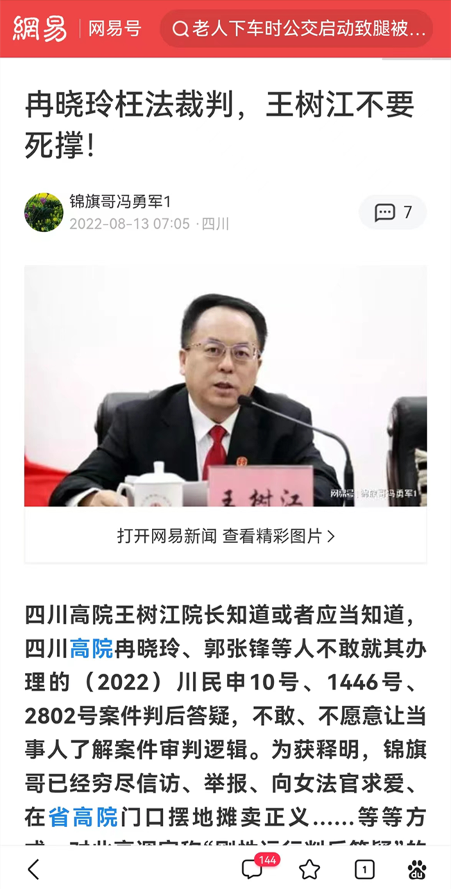 我认为这样不但打击了习的“科技兴国”战略,对其“依法治国”也是致命一击,还为组织筹得可观的经费,一举三得。王树江院长很得意地笑,话没说完,就遭到北京首长善意地批评:“这个时候,大家不要搞得太激烈,容易反弹,钱的事不用你们下面筹,我们钱丰富得很,习害怕的就是我们团队有钱,不要为了钱让我们损兵折将了,不要向我们的战友沈德咏一样,临大战了,折了!”,“任欣欣、冯勇军是怎么回事?”。王树江院长收起得意的表情,毕恭毕敬的给北京首长解释道,任欣欣的案子,冯勇军为了判后释明,就在四川省高院门口摆地摊数十次,长达几个月时间,当然,我也只有故意躲着他,那个锦旗哥冯勇军就在网上诽谤我跟审判长冉晓玲有暧昧关系...记者打断王院长好奇地问:“王院长,你到底与冉美女有没有暧昧呢?”。王树江笑而不答。继续回首长的话:“冯勇军这个刺头,太气人了,他那什么铁杆粉丝周某某,还说冉晓玲是我多年的情妇,我王树江在法院系统有43名女法官有不正当关系,真放肆”。停了停,王院长继续说:“冯勇军还赢了郫都区22件行政官司,8月19日,冯又到我高院门口寻衅滋事,我让郫都区公安局的同仁把他抓了,关在精神病院里”。北京首长肯定地说:“做得很好!”