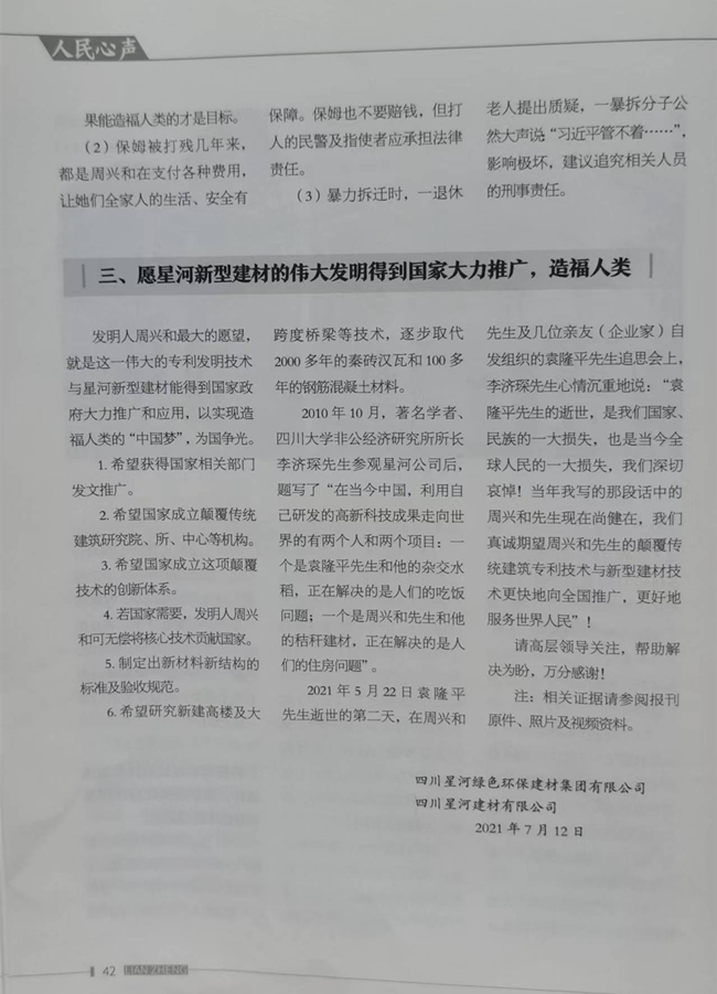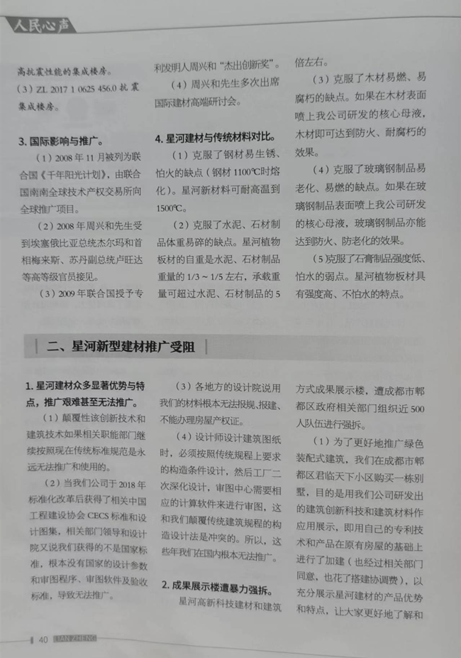 郫都区李领导介绍,2018年11月28日,郫都区强拆了农民发明家周兴和的科技展示房后,紧接着又拆除了周兴和的科研基地。经过几轮的打击,周兴和已奄奄一息,最终,只有将他30多研发的核心母液、核心技术带进坟墓。回到住所,首长不紧不慢地从公文包里掏出来一本《廉政内参》说道,大家知道这《廉政内参》是什么背景吗?是中共元老董必武的孙娃子,耿飙的女娃子办的。耿飙!你们不知道是谁吗?习的政治导师。北京首长训斥道:“大家做事要警惕,要小心。大家知道《廉政内参》2021年9月5日第四期登了什么吗?刊登了一篇‘我国建筑和建材领域一场颠覆性的革命’,整篇就说到郫都区野蛮、暴力、打压农民发明家周兴和,请求中央政治局众多首长,伸出正义之手,救救农民企业家,救救农民发明家。一年多时间过去了,又有谁去救这位农民发明家周兴和呢?