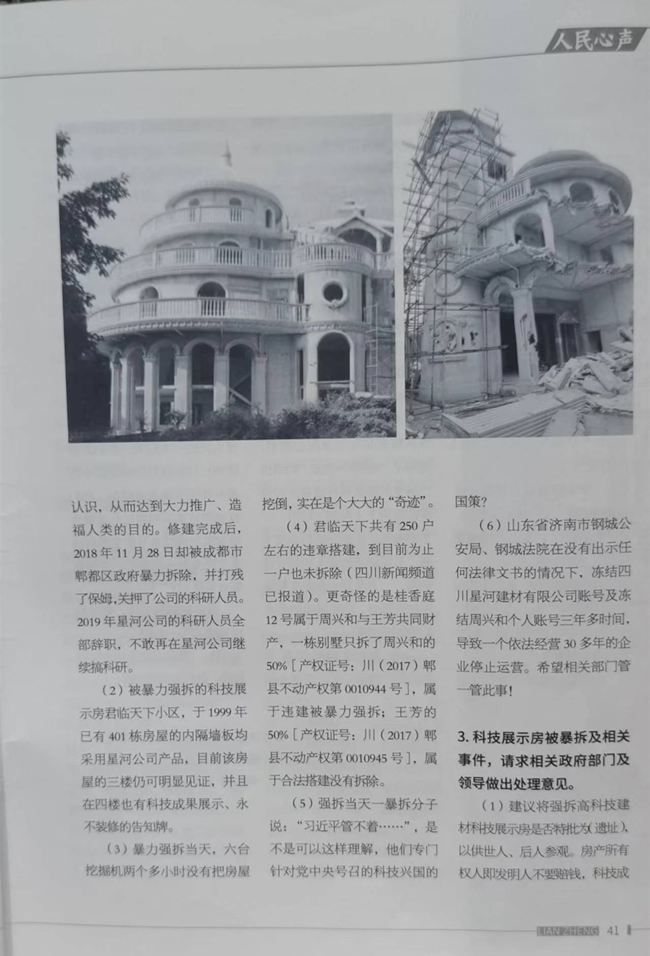 大家请在百度搜索:别墅区的圈地运动——四川电视台报道:成都郫都区君临天下别墅小区有401别墅,有250多家违规搭建。郫都区领导介绍道,首长,实话实说,郫都区真正的违规搭建,连违章搭建的住户都愿意拆除,我们郫都区至今一户都没有拆,为对抗科技兴国,郫都区相关部门积极配合,成立了专班,开数十次会议,请示上级,专门针对周兴和的颠覆性技术——科技成果展示房和他的科研基地,进行了暴力强拆,即使有人现场发出质疑“是不是习主席的天下?”,我们的强拆团队一起大声怒吼道“习近平管不着!”。首长,请您看看您手里的《廉政内参》嘛,也两次提到,“习近平管不着”。