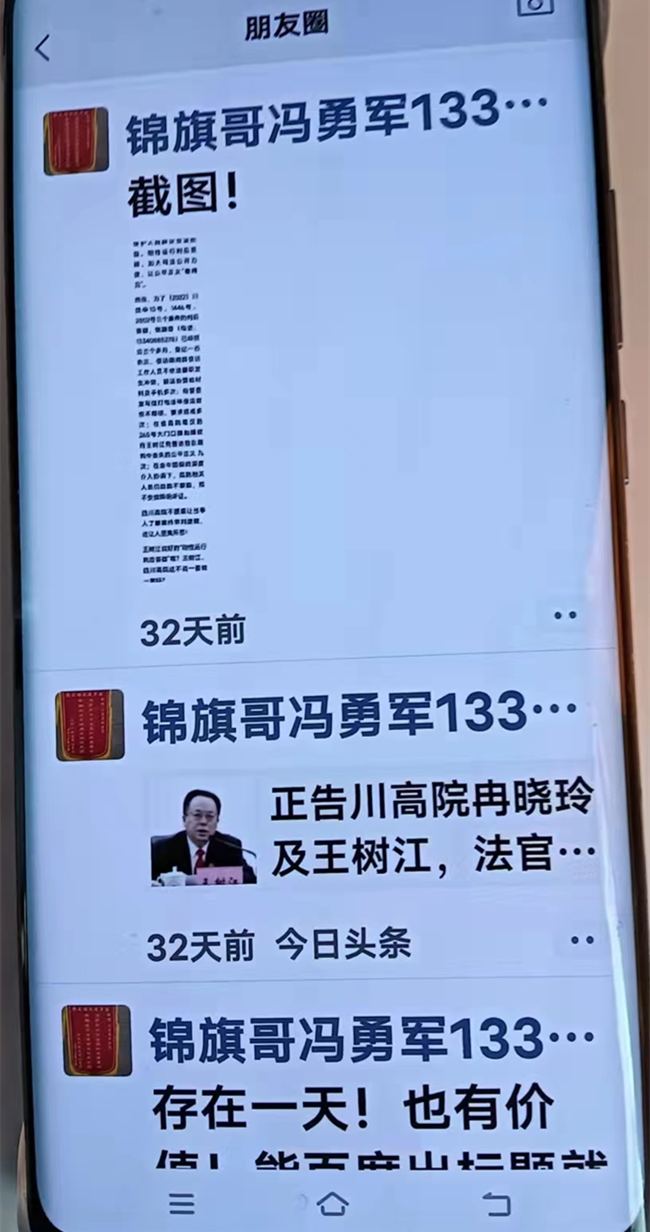 王树江笑而不答。继续回首长的话:“冯勇军这个刺头,太气人了,他那什么铁杆粉丝周某某,还说冉晓玲是我多年的情妇,我王树江在法院系统有43名女法官有不正当关系,真放肆”。停了停,王院长继续说:“冯勇军还赢了郫都区22件行政官司,8月19日,冯又到我高院门口寻衅滋事,我让郫都区公安局的同仁把他抓了,关在精神病院里”。