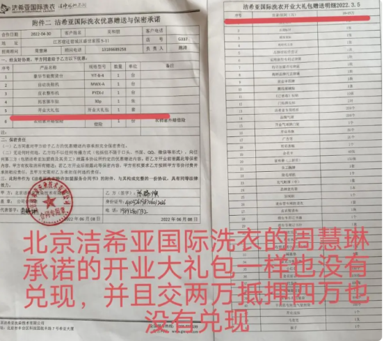 事情经过:我是2021年在抖音上看到北京洁希亚国际洗衣的宣传视频的。随后,北京洁希亚的工作人员就天天给我打电话,说有优惠活动,只需要8万多就能开一个干洗店,并且报销到北京洁希亚国际洗衣学习的来回路费,机器的运费也由公司报销,开一个干洗店的利润很可观,一年最低纯利润20万。