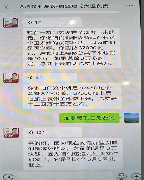 我的干洗店开业以后经营很难,他们前面所说的一系列扶持全是空谈,一样也没有兑现。我试图联系北京洁希亚老板陈友兵,我给他打电话他不接,我给他发信息也不回。我想让他帮助我们扶持我们,洁希亚的老板信息不回电话也不接,他们全部不理人,我们老百姓没有可讲理的地方!他们一环一环的各种套路骗人。