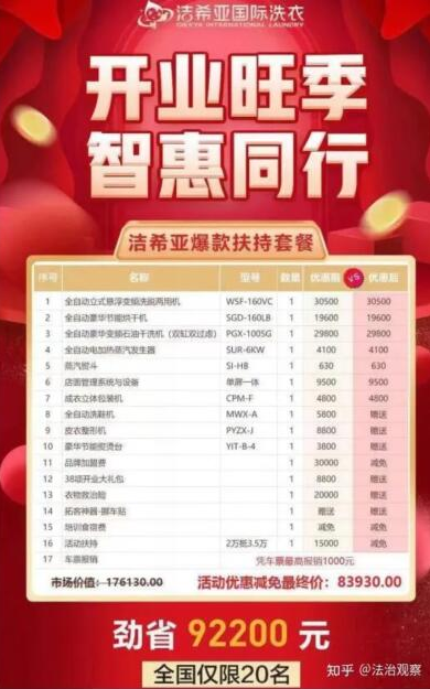 事情经过:2021年3月份,我通过百度弹窗无意之中看到北京洁希亚国际洗衣的宣传广告。该宣传广告称北京洁希亚国际洗衣在全国推出仅限20个名额的《洁希亚爆款扶持套餐》,市场价格176130元的套餐,优惠后最终价83930元。该优惠套餐包括:全自动立式悬浮变频洗脱两用机、全自动豪华节能烘干机、全自动豪华变频石油干洗机(双缸双过滤)、全自动电加热蒸汽发生器、蒸汽熨斗、店面管理系统与设备、成衣立体包装机、全自动洗鞋机、皮衣整形机、豪华节能熨烫台、品牌加盟费、38项开业大礼包、衣物救治险、拓客神器-挪车贴、培训食宿费、活动扶持、车票报销等一共17项优惠项目。