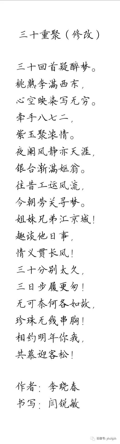 李晓春和闫锐敏是30多年前,在北京中国工运学院时同窗两载的同学。毕业后,经常保持联系,几乎每年都要聚几次。毕业后,他在北京先是开了一个小卖铺,不久又开了一个超市。起初我们以为他只会做生意,但是,自从有了微信之后,在朋友圈发了几首格律诗,而且合辙押韵,才发现他是一个才子。接下来,就让我们欣赏他的杰作吧!