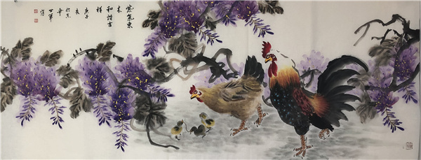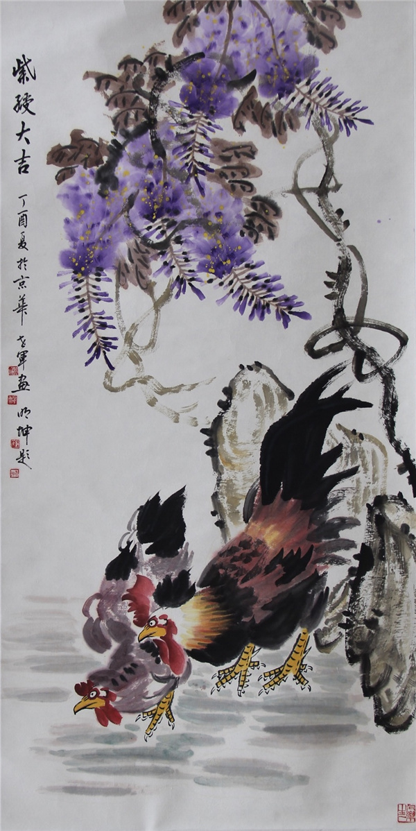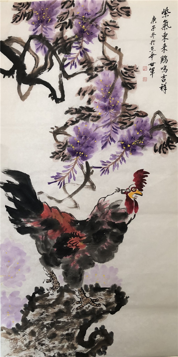 王先生作画,题材广泛,博涉多优,尤其以画雄鸡、紫藤寄寓吉祥而闻名遐迩!能够在画史为自己的艺术造诣赢得重要坐标,不能依靠普通的画题作证!唯有专题专享、独门独技方可以功传春秋,古今相望。比如郑板桥画竹、齐白石画虾都是这种情况。当下,王世军先生以独树一帜的紫藤图雄鸡图,作出了亘古未见的大功勋,成为盛世雄鸡创作的第一笔!也贵有引涉紫气东来的玄机功夫!
