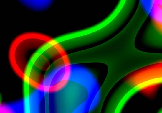 三原色是红色,蓝色和绿色。复色是指两种以上的颜色相融后形成的颜色,在分离、裂变和雕琢光色的作品中,颜色与颜色的相融都会依照自然界光变的规律形成其它的复色。七色光都是复色的体现。 下图是光被分离出来的三原色。