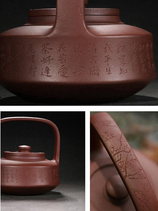 做第一把壶时,顾老对江华老师说:“现在的你是一张白纸,要在白纸上画最新最美的图画。”后来,这把紫砂壶制成后,顾老在壶身上一面写上弱水三千,另一面画上了梅花。