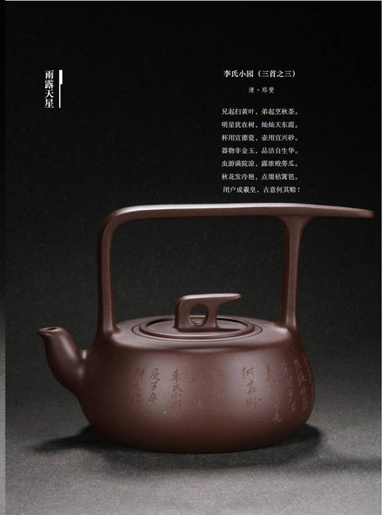 如今,老师已经是众多收藏者追捧的制壶名家,但他仍然孜孜以 求,希望自己可以把顾老的技艺继承发扬。他说自己年纪大了,也常 感到力不从心,但每天都想挤点时间在作品上,想着“器形轮廓线组 合上要和谐,要从点线面提高审美素养,还要在用一双发现美的眼睛 去过生活,吸收源源不断的灵感。”